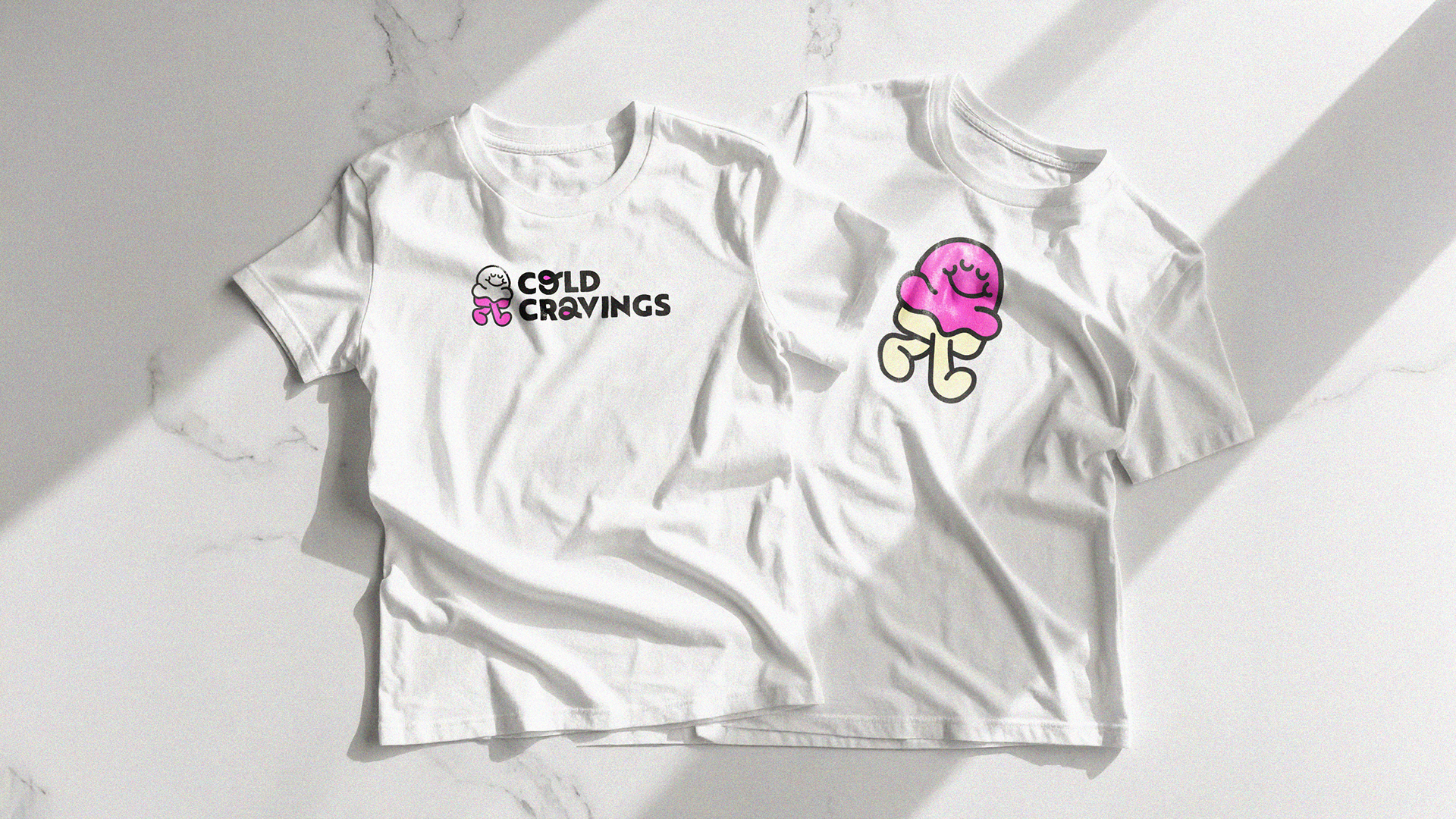 The visual identity for Cold Cravings centres around a playful custom mascot and hand-crafted logo, bringing personality and playfulness to the brand. Inspired by 1960s retro cartoons, the character was created to look like an ice cream. Blending original design work with touches of Adobe Firefly for extended storytelling, the result is a cohesive and energetic visual language that highlights the joy of ice cream—making the brand feel as fun and crave-able as its flavours.